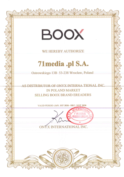 Z dumą informujemy, że 71media.pl S.A. posiada oficjalny certyfikat dystrybucyjny marki BOOX (Onyx BOOX), potwierdzający nasz status autoryzowanego dystrybutora tej marki w Polsce. Certyfikat ten potwierdza aktualny zakres naszej współpracy oraz formalny status dystrybucyjny na rynku polskim, będący kontynuacją dotychczasowej współpracy z producentem.