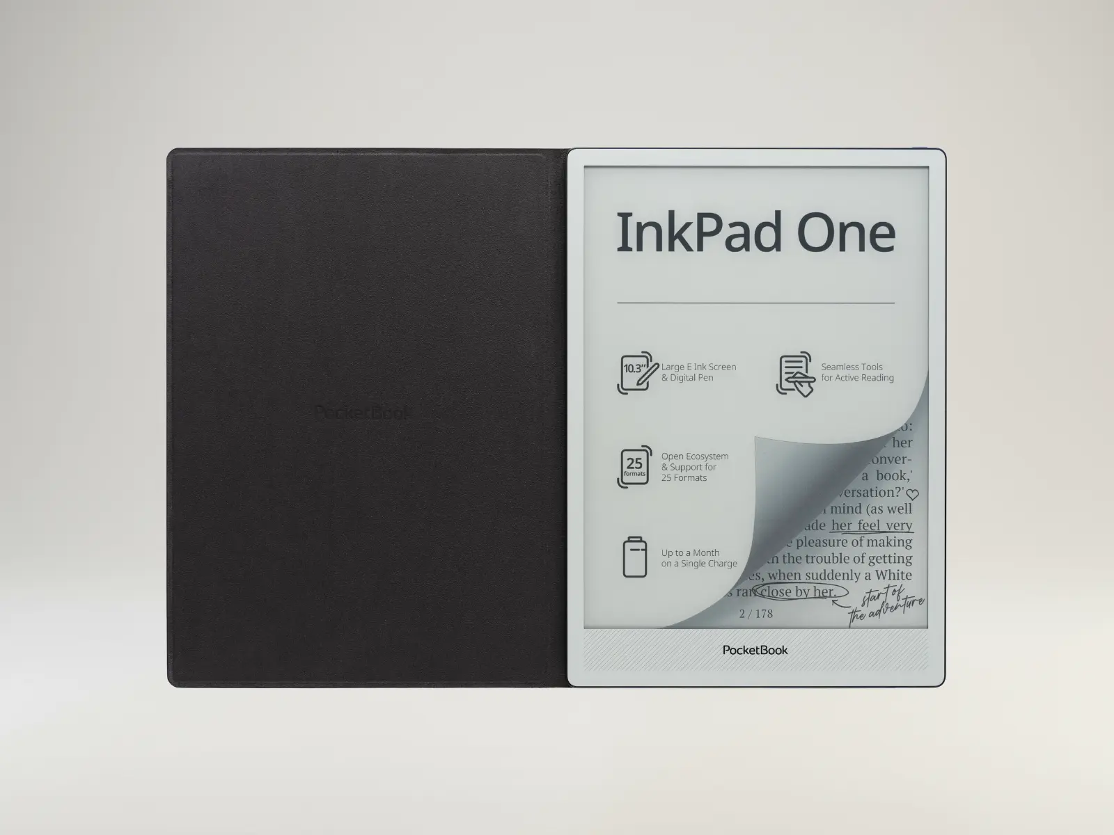 Wbudowane magnesy współpracują z czujnikiem zamknięcia. Po zamknięciu okładki PocketBook InkPad One automatycznie przechodzi w tryb uśpienia, a po jej otwarciu natychmiast się wybudza. Funkcja „sleep mode” ułatwia codzienne korzystanie i pomaga oszczędzać baterię.